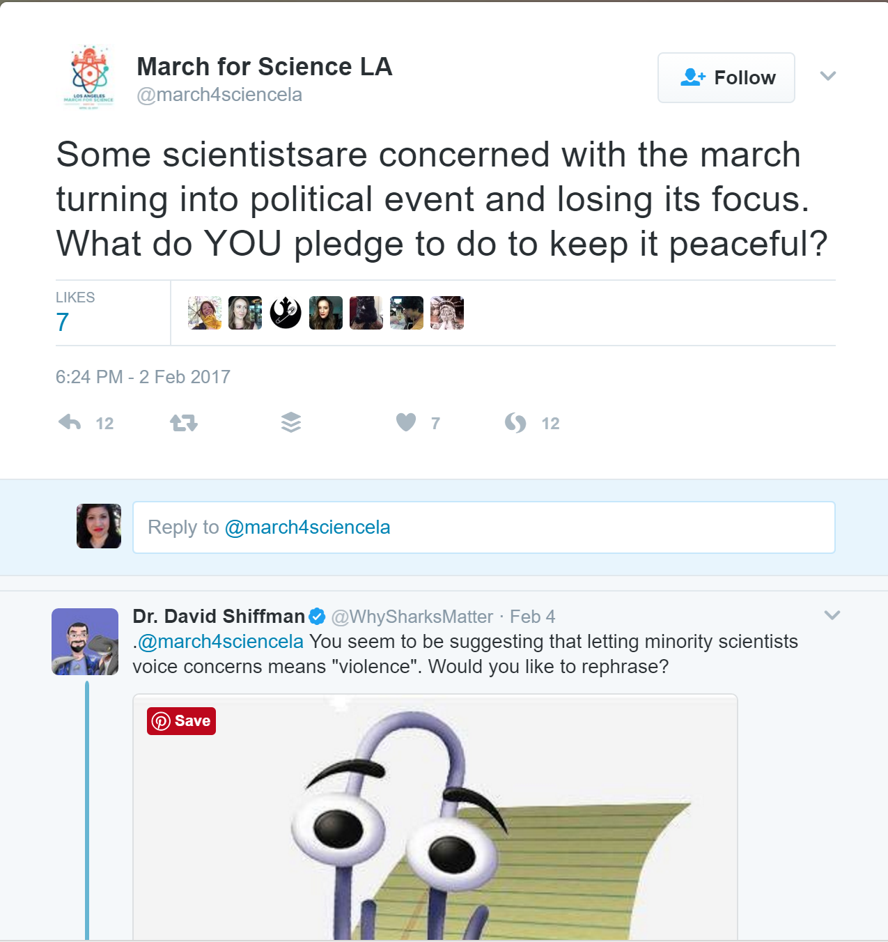 As you can see in the screenshot below, saved on 3 March, the tweet didn’t receive a lot of direct engagement (no retweets at that stage and only four “likes”), though there were a few comments. One of these was by Dr David Shiffman, marine conservation biologist, who used an image of the “Clipppy” meme to say: “You seem to be suggesting that letting minority scientists voice concerns means ‘violence.’ Would you like to rephrase?”